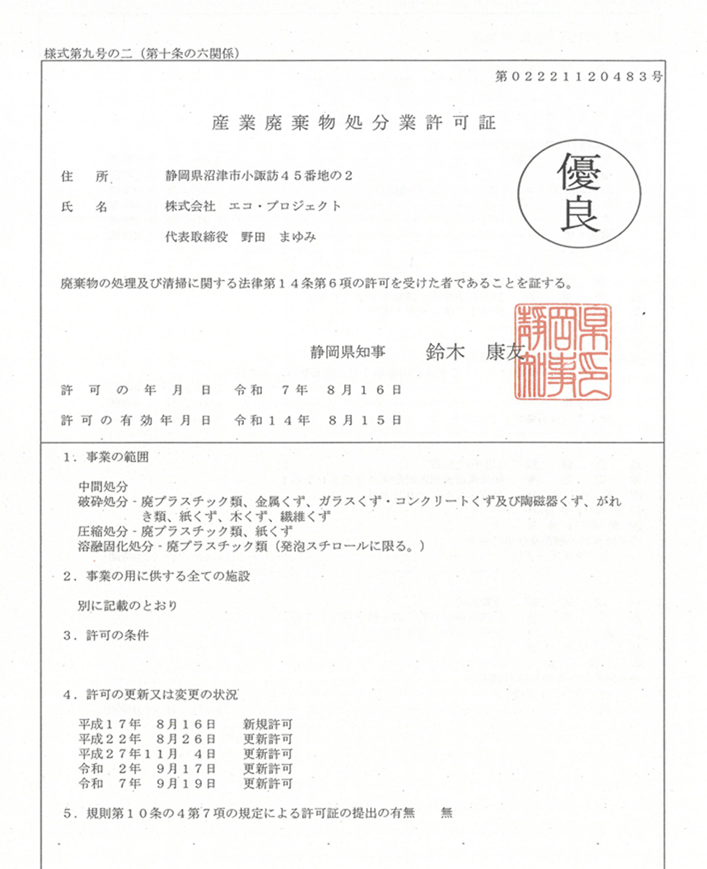 このたびグループ会社であるエコ・プロジェクトが産業廃棄物処分業において、厳格な基準を満たした事業者のみが受けられる「優良産廃処理業者認定(優良認定)」を取得いたしました。